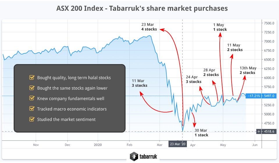 When COVID-19 started, fear crept into the economy and panic selling ensued on global share markets including the ASX. Fahd and I were calm and objective, applying everything we had learnt over the years. Most of our purchases ended up being on the 23rd of March, the absolute bottom so far. We didn’t predict it. We were simply prepared for the market to go up or down, and had a clear strategy to execute in either scenario.