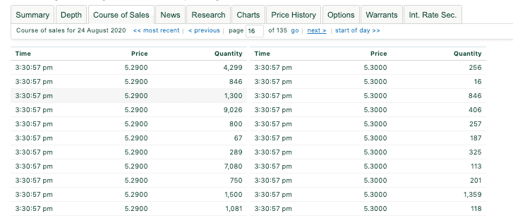 A: The last transaction where a buyer’s price and a seller’s price was matched is the share price at that moment in time. You can see this in most broker systems as ‘Course of Sales’ or ‘Trades’ to see the last transaction that was executed for the company.