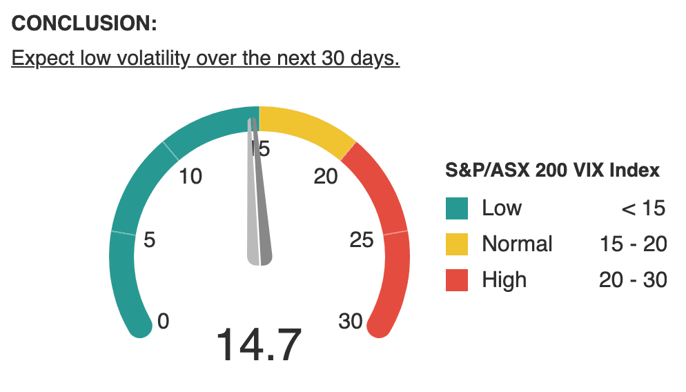 The S&P/ASX 200 VIX Index (XVI) calculates the amount of volatility expected in the market over the next 30 days.