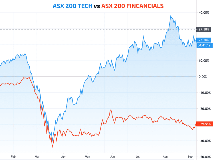 As an example look at the ASX 200 indexes for all tech companies vs financial sector since Feb 2020.